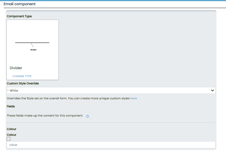 A Custom Style Override dropdown is available, allowing users to apply a unique style that differs from the overall form or template. This is useful for adjusting the divider’s colour, thickness, or spacing to match branding or campaign design.