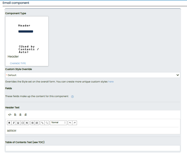 A Custom Style Override dropdown is available, allowing users to apply a unique style that differs from the overall form or template. This is useful for aligning the header with branding, colour schemes, or specific campaign themes.