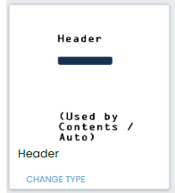 When selected, the interface identifies the component type as “Header” and displays a visual icon representing a horizontal banner. A note indicates that it is “Used by Contents / Auto,” meaning it may be automatically inserted or referenced by other components. Users can click “CHANGE TYPE” to switch to a different layout if needed.