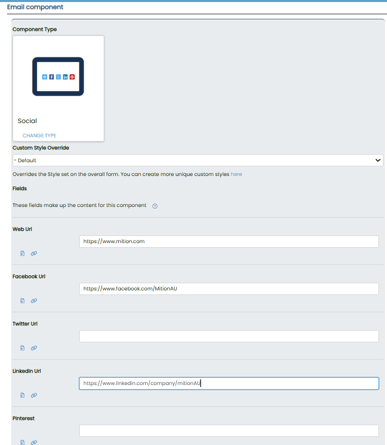 A Custom Style Override dropdown is available, allowing users to apply a unique style that differs from the overall form or template. This is useful for aligning the social icons with your brand colours or layout preferences.
