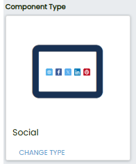 When selected, the interface identifies the component type as “Social” and displays a visual icon representing popular platforms such as Facebook, Twitter, LinkedIn, and Pinterest. Users can click “CHANGE TYPE” to switch to a different layout if required.
